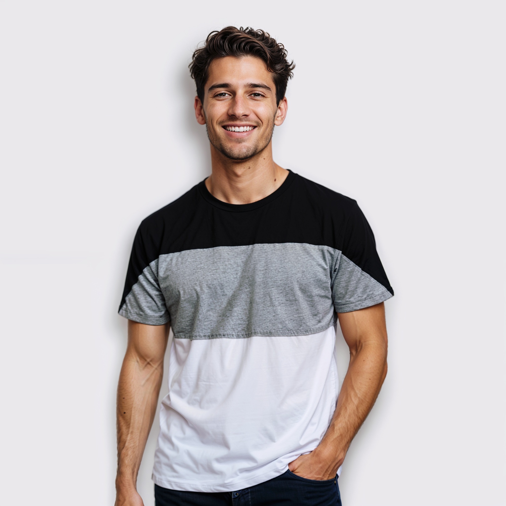 Diseño pensado para destacar. Con detalles de en hombros y mangas, esta playera de tres colores impone carácter sin perder la versatilidad. Su corte regular y cuello redondo ofrecen un ajuste clásico y cómodo, ideal para el día a día, mientras su tela ligera y suave acompaña cada movimiento con naturalidad.
